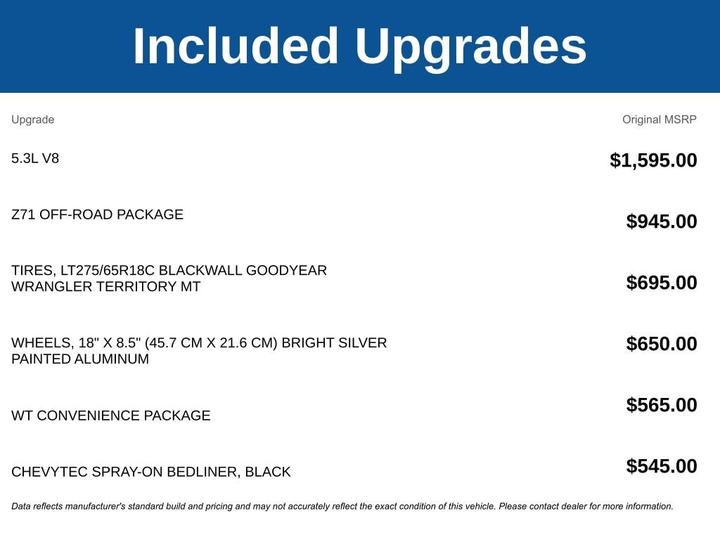 Preferred Equipment Group 1WT (3.5 Monochromatic Display Driver Info Center, 4-Way Manual Driver Seat Adjuster, 40/20/40 Front Split-Bench Seat, Black (Semi-Gloss) Front Bumper, Black (Semi-Gloss) Rear Bumper, Black Manual Outside Mirrors, Bluetooth® For Phone, Electronic Cruise Control, Front Frame-Mounted Black Recovery Hooks, HD Rear Vision Camera, Inside Rearview Mirror with Tilt, Locking Tailgate, Manual Tailgate Function with No EZ Lift, Manual Tilt Wheel Steering Column, OnStar Services Capable, Power Front Windows with Driver Express Up/Down, Power Front Windows with Passenger Express Down, Power Rear Windows with Express Down, Rear 60/40 Folding Bench Seat (folds Up), Remote Keyless Entry, Rubberized-Vinyl Floor Covering, SiriusXM Delete, Solar Absorbing Tinted Glass, Standard Tailgate, Teen Driver, Tire Pressure Monitoring System, Vinyl Seat Trim, Wheels: 17 x 8 Ultra Silver Painted Steel, and Wi-Fi Hot Spot Capable), Standard Suspension Package, WT Convenience Package (Deep-Tinted Glass, Electric Rear-Window Defogger, and Heated Power-Adjustable Outside Mirrors), Z71 Off-Road Package (Auto-Locking Rear Differential, Heavy-Duty Air Filter, Hill Descent Control, and Off-Road Suspension), 10-Speed Automatic, 4WD, Jet Blk Vinyl, 170 Amp Alternator, 220 Amp Alternator, 4-Wheel Disc Brakes, 6 Speakers, 6-Speaker Audio System, ABS brakes, Air Conditioning, Apple CarPlay/Android Auto, Auto High-beam Headlights, Automatic Emergency Braking, Auxiliary External Transmission Oil Cooler, Brake assist, Chevytec Spray-on Black Bedliner, Compass, Delay-off headlights, Driver door bin, Dual front impact airbags, Dual front side impact airbags, Electronic Stability Control, Emergency communication system: OnStar, External Engine Oil Cooler, Following Distance Indicator, Forward Collision Alert, Front anti-roll bar, Front Center Armrest w/Storage, Front License Plate Kit, Front Pedestrian Braking, Front reading lights, Front wheel independent suspension, Fully automatic headlights, Illuminated entry, IntelliBeam Automatic High Beam on/Off, Lane Keep Assist with Lane Departure Warning, Low tire pressure warning, Occupant sensing airbag, Outside temperature display, Overhead airbag, Overhead console, Panic alarm, Passenger door bin, Passenger vanity mirror, Power steering, Power windows, Premium audio system: Chevrolet Infotainment 3, Radio data system, Radio: Chevrolet Infotainment 3 System, Rear reading lights, Rear step bumper, Remote keyless entry, Speed control, Speed-sensing steering, Split folding rear seat, Tachometer, Tilt steering wheel, Traction control, Trip computer, Variably intermittent wipers, Voltmeter, and Wheels: 18 x 8.5 Bright Silver Painted Aluminum Doc fee of $225.00 included in advertised sales price. Price includes: $1500 - Chevrolet Bonus Cash. Exp. 04/30/2026 $4250 - Chevrolet Consumer Cash Program. Exp. 04/30/2026