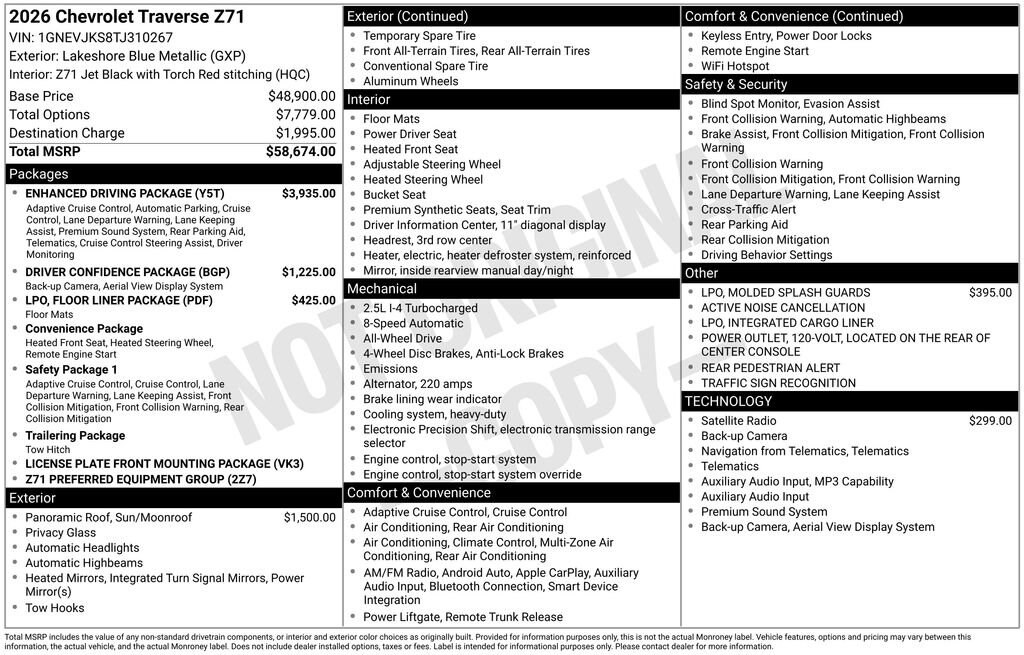 Dealer Discount of $800 off MSRP Dealer Discount Available to Everyone. Lakeshore Blue 2026 Chevrolet Traverse Z71 AWD 2.5L DOHC 8-Speed Automatic AWD.Driver Confidence Package (HD Surround Vision, Key Card, Power Outlet, Rear Camera Mirror, Rear Pedestrian Alert, and Traffic Sign Recognition), Enhanced Driving Package (Active Noise Cancellation, Bose Premium 12-Speaker Audio System Feature, Driver Attention Assist, Enhanced Automatic Parking Assist, and Super Cruise), Floor Liner Package (1st and 2nd Row All-Weather Floor Liners, 3rd Row All-Weather Floor Liner, and Integrated Cargo Liner), Preferred Equipment Group 2Z7, AWD, 3 Years SiriusXM, 3rd row seats: split-bench, 4-Way Manual Front Passenger Seat Adjuster, 4-Wheel Disc Brakes, 6 Speakers, 6-Speaker Audio System Feature, 8-Way Power Driver Seat Adjuster, ABS brakes, Air Conditioning, Alloy wheels, AM/FM radio: SiriusXM with 360L, Apple CarPlay/Android Auto, Auto High-beam Headlights, Automatic temperature control, Brake assist, Bumpers: body-color, Child-Seat-Sensing Airbag, Compass, Delay-off headlights, Driver door bin, Driver vanity mirror, Dual front impact airbags, Dual front side impact airbags, Electronic Stability Control, Emergency communication system: OnStar, Evotex Seat Trim, Four wheel independent suspension, Front anti-roll bar, Front Bucket Seats, Front Center Armrest, Front dual zone A/C, Front reading lights, Fully automatic headlights, Heated door mirrors, Heated Driver and Front Passenger Seats, Heated front seats, Heated steering wheel, Illuminated entry, Low tire pressure warning, Molded Splash Guards, Navigation System, Occupant sensing airbag, Outside temperature display, Overhead airbag, Overhead console, Panic alarm, Passenger door bin, Passenger vanity mirror, Power door mirrors, Power driver seat, Power Dual Glass Panoramic Sliding Sunroof, Power Liftgate, Power steering, Power windows, Radio data system, Radio: : Audio System w/17.7 Diagonal Display, Rear air conditioning, Rear anti-roll bar, Rear reading lights, Rear window defroster, Rear window wiper, Remote keyless entry, Security system, SiriusXM with 360L Trial Subscription, Speed control, Speed-sensing steering, Split folding rear seat, Spoiler, Steering wheel mounted audio controls, Tachometer, Telescoping steering wheel, Tilt steering wheel, Traction control, Trip computer, Turn signal indicator mirrors, Variably intermittent wipers, Voltmeter, and Wheels: : 18 High Gloss Black Painted Aluminum Doc fee of $225.00 included in advertised sales price.