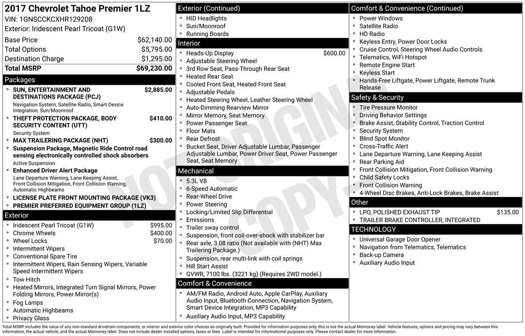 Body Security Content Theft Protection Package (Theft-Deterrent Alarm System, Vehicle Inclination Sensor, and Vehicle Interior Movement Sensor), Enhanced Driver Alert Package (Y86) (Forward Collision Alert Sensor Indicator, IntelliBeam Headlamps, Lane Keep Assist, and Low Speed Forward Automatic Braking), License Plate Front Mounting Package, Magnetic Ride Control Suspension Package, Max Trailering Package (Integrated Trailer Brake Controller), Preferred Equipment Group 1LZ (1st & 2nd Row Color-Keyed Carpeted Floor Mats, 3rd Row 60/40 Power Fold Split-Bench, 4-Wheel Antilock Disc Brakes w/Brake Assist, Auto-Dimming Inside Rear-View Mirror, Black Assist Steps w/Chrome Accent Strip, Bose Centerpoint Premium 10-Speaker Surround Sound, Color-Keyed Carpeting Floor Covering, Driver Inboard & Front Passenger Airbags, Electronic Cruise Control w/Set & Resume Speed, Enhanced Driver Information Center, Floor Console, Fog Lamps, Front & Rear Parking Assist, Hands Free Power Liftgate, Heated 2nd Row Seats, Heated Leather Wrapped Steering Wheel, Memory Settings, NavTraffic, OnStar Basic Plan For 5 Years, Passive Entry System, Power Release 2nd Row Bucket Seats, Power Tilt & Telescopic Steering Column, Power-Adjustable Accelerator & Brake Pedals, Power-Folding Heated Outside Mirrors, Push Button Keyless Start, Rear Cross-Traffic Alert, Remote Keyless Entry, Remote Vehicle Start, Roof-Mounted Luggage Rack Side Rails, Side Blind Zone Alert w/Lane Change Alert, SiriusXM Satellite Radio, Universal Home Remote, and Wireless Charging), Sun, Entertainment & Destinations Package (Power Sunroof and Rear Seat Blu-Ray/DVD Entertainment System), Cocoa/Dune Leather, 10 Speakers, 3rd row seats: split-bench, 4-Wheel Disc Brakes, 5 12-Volt Auxiliary Power Outlets, 6-Way Power Front Passenger Seat Adjuster, ABS brakes, Adaptive suspension, Adjustable pedals, Air Conditioning, Alloy wheels, AM/FM radio: SiriusXM, Apple CarPlay/Android Auto, Auto High-beam Headlights, Auto-dimming door mirrors, Auto-dimming Rear-View mirror, Automatic temperature control, Bodyside moldings, Brake assist, Bumpers: body-color, Cargo Net, CD player, Compass, Delay-off headlights, Driver door bin, Driver vanity mirror, Dual front impact airbags, Dual front side impact airbags, Electronic Stability Control, Emergency communication system: OnStar Guidance, Exterior Parking Camera Rear, Front anti-roll bar, Front Bucket Seats, Front Center Armrest, Front dual zone A/C, Front fog lights, Front Heated Reclining Bucket Seats, Front reading lights, Front wheel independent suspension, Fully automatic headlights, Garage door transmitter, Head-Up Display, Heated & Vented Driver & Front Passenger Seats, Heated door mirrors, Heated front seats, Heated rear seats, Heated steering wheel, High-Intensity Discharge Headlights, Illuminated entry, Low tire pressure warning, Memory seat, Navigation System, Occupant sensing airbag, Outside temperature display, Overhead airbag, Overhead console, Panic alarm, Passenger door bin, Passenger vanity mirror, Pedal memory, Perforated Leather-Appointed Seat Trim, Polished Exhaust Tip, Power door mirrors, Power driver seat, Power Liftgate, Power passenger seat, Power steering, Power windows, Premium audio system: Chevrolet MyLink, Radio: Chevrolet MyLink w/Nav/AM/FM Stereo, Rain sensing wipers, Rear air conditioning, Rear anti-roll bar, Rear reading lights, Rear window defroster, Rear window wiper, Remote keyless entry, Roof rack: rails only, Security system, Set of 4 Wheel Locks (LPO), Single-Slot CD/MP3 Player, Speed control, Speed-sensing steering, Split folding rear seat, Spoiler, Steering wheel memory, Steering wheel mounted audio controls, Tachometer, Telescoping steering wheel, Tilt steering wheel, Traction control, Trip computer, Turn signal indicator mirrors, Variably intermittent wipers, Ventilated front seats, Voltmeter, Wheels: 20 x 9 Chrome, and Wheels: 20 x 9 Polished-Aluminum Doc fee of $225.00 included in advertised sales price. Cocoa/Dune