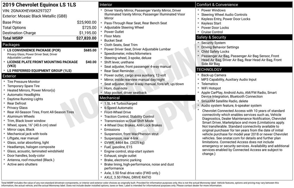 LS Convenience Package (2-Way Power Driver Lumbar Control Seat Adjuster, 8-Way Power Driver Seat Adjuster, and Deep-Tinted Rear Glass), Preferred Equipment Group 1LS (Carpeted Rear Floor Mats and Mechanical Jack w/Tools), 17 Aluminum Wheels, 2 Rear USB Charging-Only Ports, 2 USB Ports & Auxiliary Input Jack, 3.50 Final Drive Axle Ratio, 4-Way Manual Driver Seat Adjuster, 4-Wheel Disc Brakes, 6 Speaker Audio System Feature, 6 Speakers, ABS brakes, Air Conditioning, Alloy wheels, AM/FM radio, Apple CarPlay/Android Auto, Bluetooth® For Phone, Brake assist, Bumpers: body-color, Compass, Delay-off headlights, Driver door bin, Driver vanity mirror, Dual front impact airbags, Dual front side impact airbags, Electronic Stability Control, Emergency communication system: OnStar and Chevrolet connected services capable, Four wheel independent suspension, Front anti-roll bar, Front Bucket Seats, Front Center Armrest, Front Passenger 4-Way Manual Seat Adjuster, Front reading lights, Fully automatic headlights, Heated door mirrors, Illuminated entry, Low tire pressure warning, Occupant sensing airbag, Outside temperature display, Overhead airbag, Overhead console, Panic alarm, Passenger door bin, Passenger vanity mirror, Power door mirrors, Power steering, Power windows, Premium audio system: Chevrolet MyLink, Premium Cloth Seat Trim, Radio data system, Radio: Chevrolet Infotainment 3 System w/AM/FM, Rear anti-roll bar, Rear reading lights, Rear seat center armrest, Rear window defroster, Rear window wiper, Remote keyless entry, Security system, SiriusXM Radio Delete, Speed control, Speed-sensing steering, Split folding rear seat, Spoiler, Steering wheel mounted audio controls, Tachometer, Telescoping steering wheel, Tilt steering wheel, Traction control, Trip computer, and Variably intermittent wipers Doc fee of $225.00 included in advertised sales price. Priced below KBB Fair Purchase Price! Mosaic Black Metallic 4D Sport Utility Recent Arrival! 2019 Chevrolet Equinox LS FWD 26/32 City/Highway MPG 6-Speed Automatic Electronic with Overdrive 1.5L DOHC
