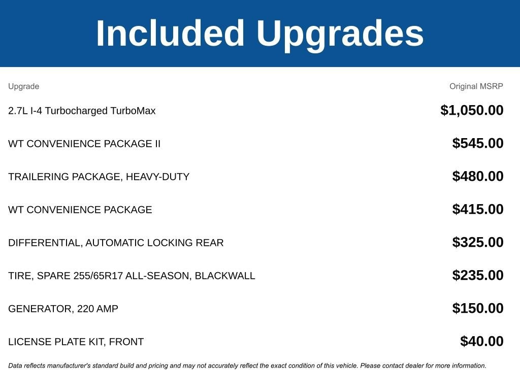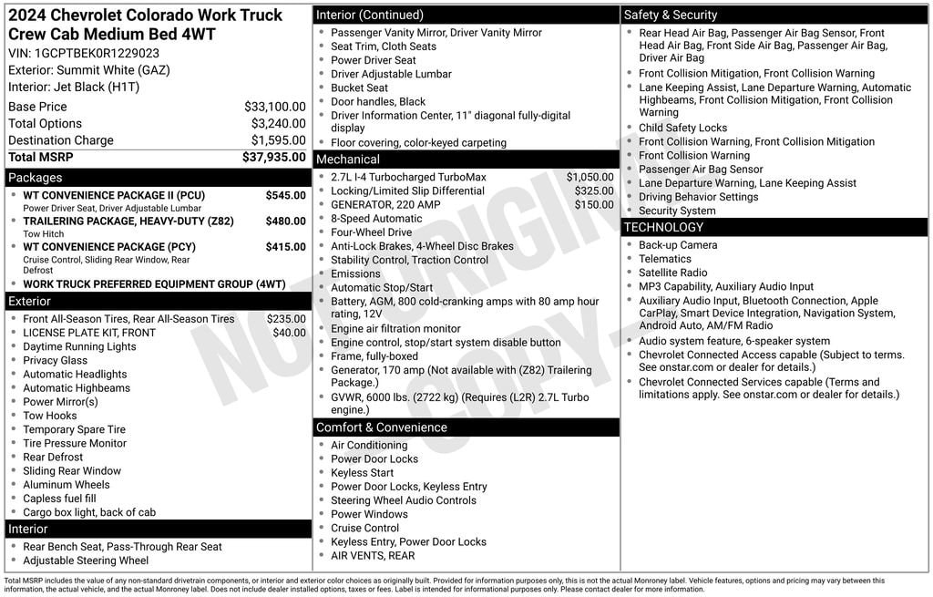 Heavy-Duty Trailering Package (Integrated Trailer Brake Controller), Preferred Equipment Group 4WT (Automatic Emergency Braking, Chevy Safety Assist, Following Distance Indicator, Forward Collision Alert, Front Pedestrian & Bicyclist Braking, IntelliBeam Automatic High Beam On/Off, and Lane Keep Assist w/Lane Departure Warning), WT Convenience Package (Electronic Automatic Cruise Control, Front Floor Console Compartment w/Cup Holders, Manual Rear-Sliding Window, Rear Air Vents, Rear-Window Electric Defogger, and Remote Locking Tailgate), WT Convenience Package II (8-Way Power Driver Seat Adjuster, EZ-Lift & Lower Tailgate, Power Driver Lumbar Control Seat Adjuster, StowFlex Tailgate Storage Compartment, and Tailgate Keyed Cylinder Lock), 4WD, 220 Amp Generator, 3.42 Rear Axle Ratio, 4-Way Manual Passenger Seat Adjuster, 4-Wheel Disc Brakes, 6 Speakers, 6-Speaker Audio System Feature, 6-Way Manual Driver Seat Adjuster, ABS brakes, Air Conditioning, AM/FM radio: SiriusXM, Apple CarPlay/Android Auto, Auto High-beam Headlights, Automatic Locking Rear Differential, Brake assist, Cloth Seat Trim, Delay-off headlights, Driver door bin, Driver vanity mirror, Dual front impact airbags, Dual front side impact airbags, Electronic Stability Control, Front anti-roll bar, Front Bucket Seats, Front Center Armrest, Front License Plate Kit, Front wheel independent suspension, Low tire pressure warning, Navigation System, Occupant sensing airbag, Overhead airbag, Panic alarm, Passenger door bin, Passenger vanity mirror, Power door mirrors, Power steering, Power windows, Radio data system, Radio: 11.3 Diagonal Advanced Color LCD Display, Rear step bumper, Remote keyless entry, Security system, SiriusXM Radio, Speed-sensing steering, Split folding rear seat, Steering Wheel Mounted Audio Controls, Steering wheel mounted audio controls, Tachometer, Tilt steering wheel, Traction control, Trip computer, Variably intermittent wipers, Wheels: 17 x 8 Ultra Silver Metallic Steel, and Wireless Phone Projection Doc fee of $225.00 included in advertised sales price. 4WD. Summit White 4D Crew Cab Recent Arrival! 2024 Chevrolet Colorado Work Truck 4WD 8-Speed Automatic 2.7L I4 Turbocharged DOHC 16V LEV3-ULEV50 237hp