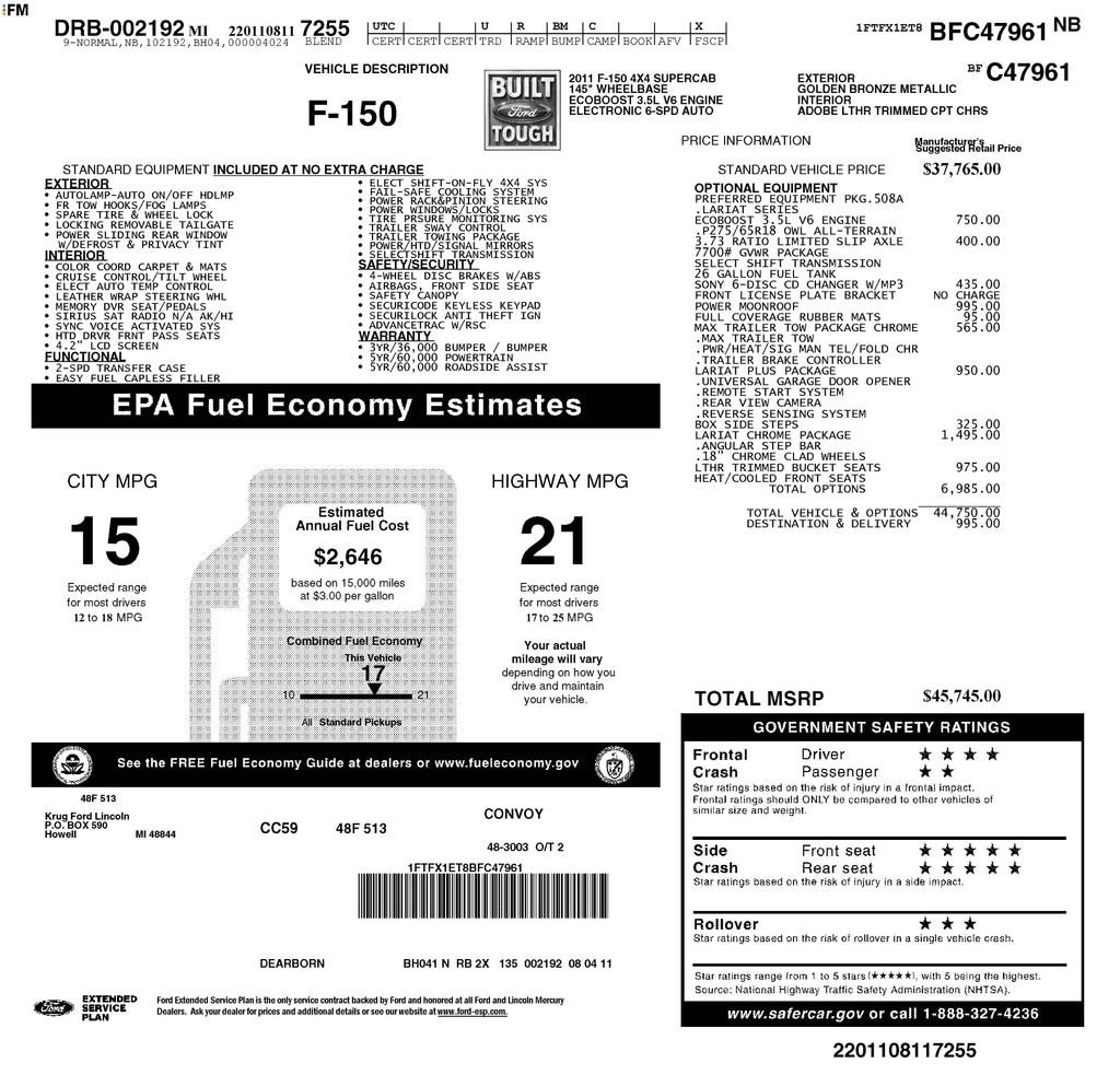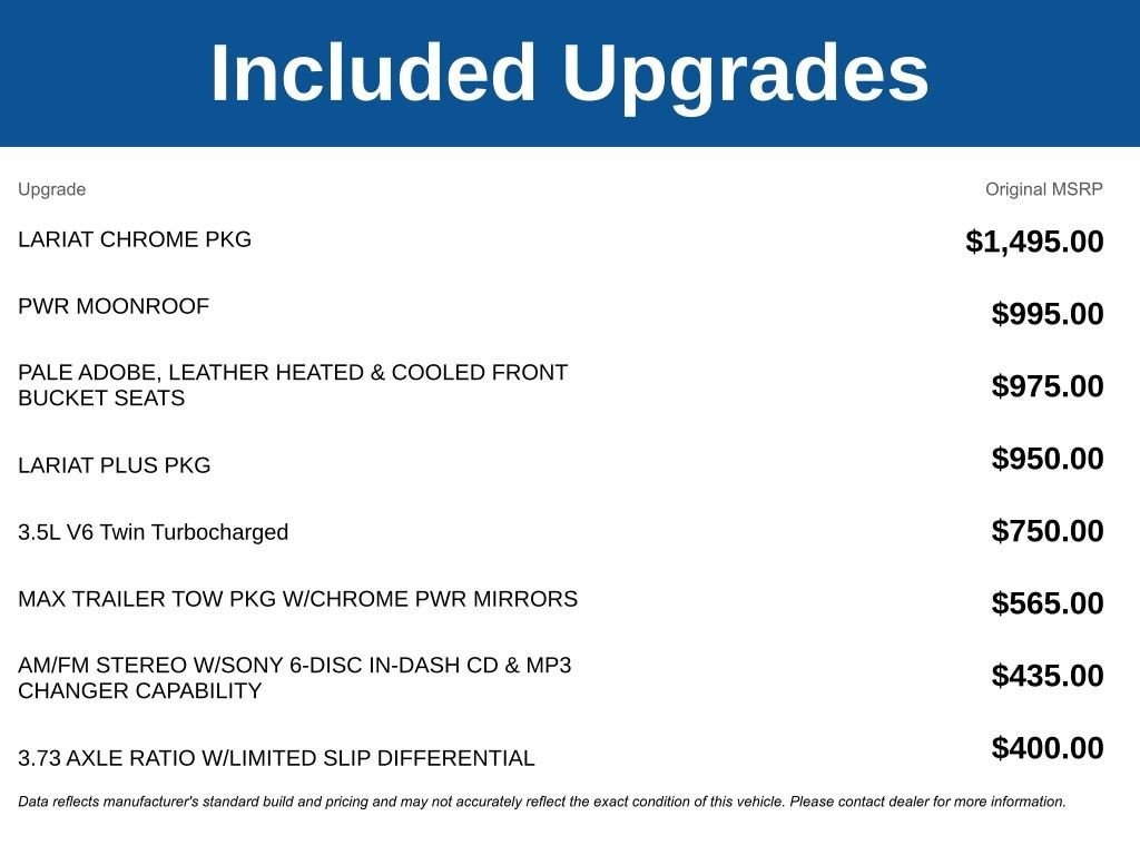 Discover the power and versatility of this 2011 Ford F-150 Lariat. With its impressive 3.5L V6 engine, 4-wheel drive, and a host of premium features, this truck is ready to take on any challenge you throw its way.- 3.55 Axle Ratio- Electronic Locking w/3.73 Axle Ratio- Limited Slip w/3.73 Axle Ratio- Leather-Trimmed 40/20/40 Front Seat- Power Driver Seat- Power Passenger Seat- Heated Front Seats- Dual-Zone Automatic Climate Control- Rearview Camera- Remote Keyless EntryWhether you're hauling heavy loads, navigating rough terrain, or simply enjoying the open road, this F-150 Lariat is up for the task. With its spacious interior, advanced technology, and refined styling, this truck offers the perfect blend of capability and comfort.Imagine yourself behind the wheel, effortlessly maneuvering through city streets or conquering off-road adventures. The 4-wheel drive system and powerful engine provide the confidence and control you need, while the leather-wrapped steering wheel and adjustable pedals ensure a personalized driving experience.Step inside and you'll be greeted by a wealth of premium features designed to enhance your driving experience. Dual-zone automatic climate control keeps you and your passengers comfortable, while the rearview camera and remote keyless entry add convenience and peace of mind.This 2011 Ford F-150 Lariat is more than just a truck it's a testament to Ford's commitment to quality, innovation, and customer satisfaction. With its impressive performance, versatile capabilities, and refined amenities, this F-150 is the perfect companion for your active lifestyle.Don't miss your chance to experience the power and sophistication of this exceptional vehicle. Visit our showroom today and let us demonstrate how this 2011 Ford F-150 Lariat can exceed your expectations and become the ultimate partner for your adventures.